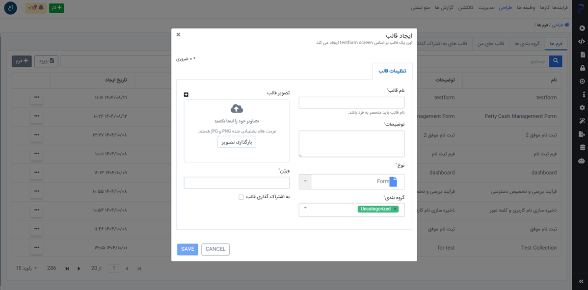 برای هر فرم امکان ویرایش، ذخیره بهعنوان قالب، دریافت خروجی و حذف وجود دارد.