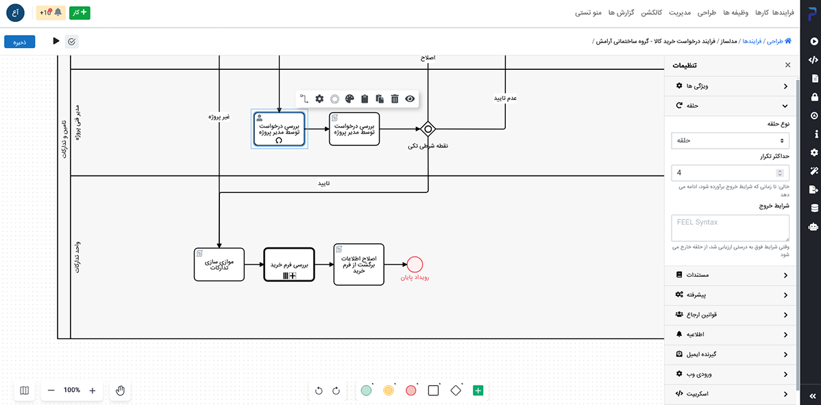 امکان استفاده از Standard Loop (تکرار شرطی) و Multi-Instance Loop (موازی یا ترتیبی) در تسکها (مانند User Task یا Script Task) وسابفرایندها در محیط طراحی فرایند پیشرو فراهم شده است.