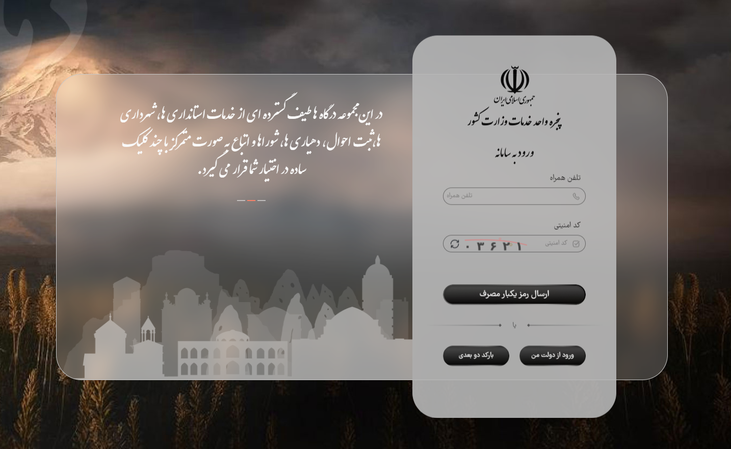 ورود ایمن از طریق سامانه ملی: کاربران میتوانند در فرم ورود با کلیک روی دکمه "ورود از طریق پنجره واحد وزارت کشور"، به سایت SSO کشوری هدایت شده و با وارد کردن شماره همراه و کد تأیید پیامکی، به صورت خودکار وارد برنامه شوند.