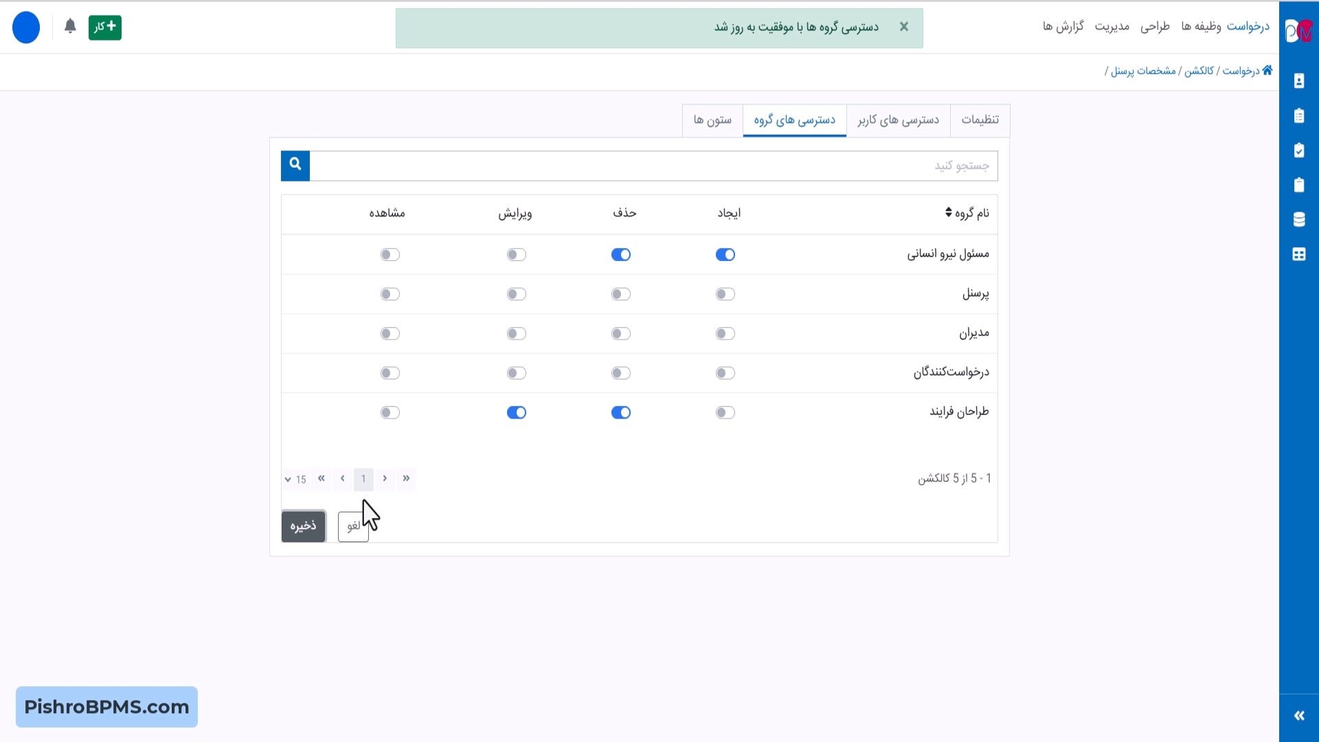 لیست رکوردها با 4سطح مشاهده، ایجاد، ویرایش و حذف، قابل دسترسی به کاربران و گروههای کاربری می باشند.