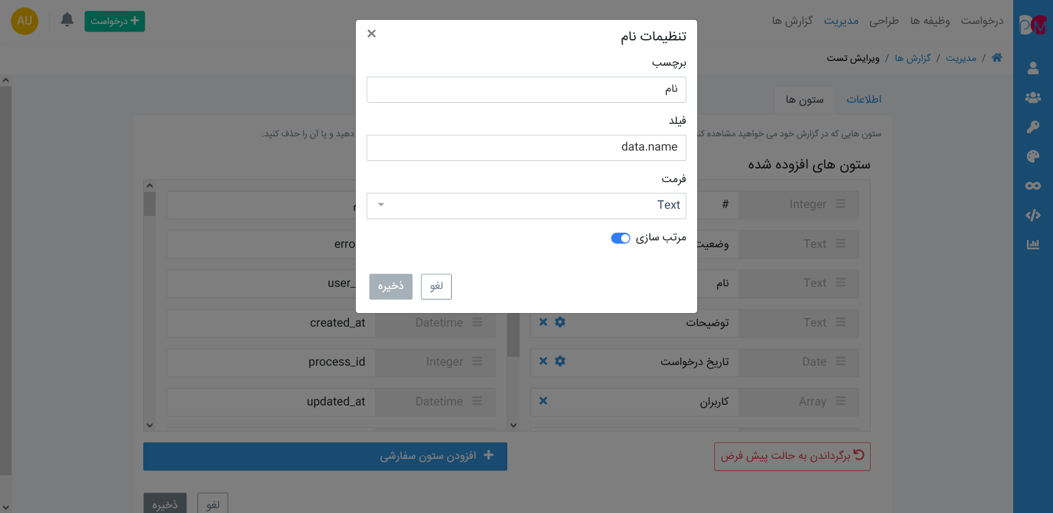 ایجاد گزارشات از فرایندهای مختلف با امکان فیلتر و مرتبسازی دادهها و خروجی اکسل
